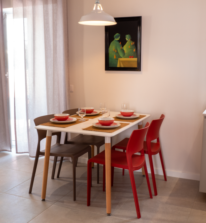 A organização dos apartamentos por tipologias e cores obedeceu a critérios de coerência e harmonia; privilegiou-se a cor cardeal (vermelho) para os mais numerosos os T1s; verde mostarda, luminoso para os mais exíguos os T0s e o os azuis mar e céu para o T2.